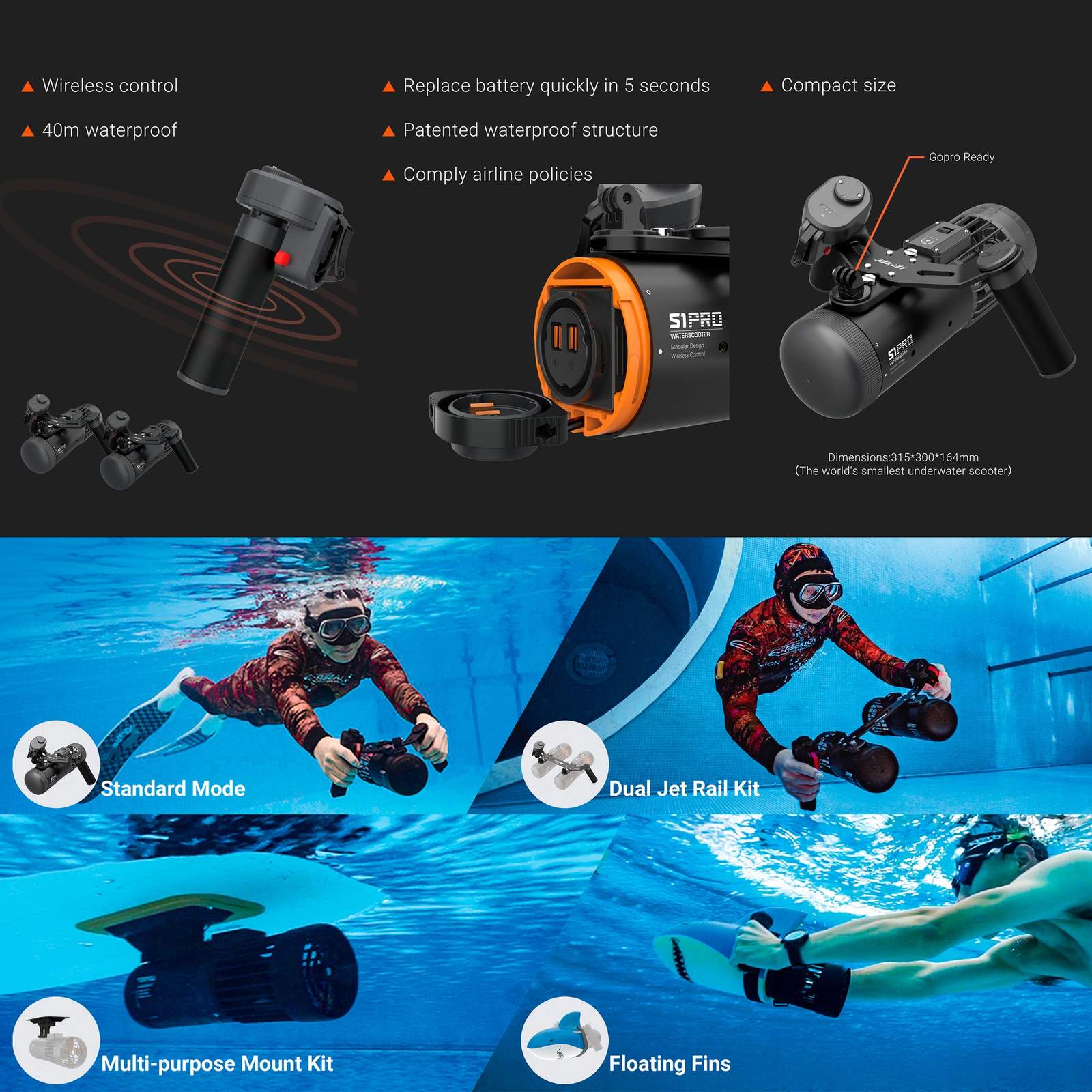 Description: The Lefeet S1 PRO is a compact, hi-tech underwater scooter that delivers powerful propulsion to help divers, snorkelers, and swimmers move faster and with less effort. Its modular, Good Design Award–winning body is approximately 5% smaller than the original S1, making it lighter, easier to travel with, and simple to stow in a backpack or dive bag. A sealed, high-strength housing and patented waterproof structure are depth-rated to 40 m (131 ft) for reliable performance below the surface. The wireless remote lets you operate the scooter hands-free in various configurations, and the quick-swap, airline-compliant battery provides 35–70 minutes of run time per charge. Three selectable speed gears (up to 1.8 m/s single unit; up to 2.3 m/s with a dual-jet setup) reduce fatigue, conserve air, and make returning to shore in currents easier. The S1 PRO’s modular ecosystem supports multiple mounts and accessories, enabling configurations for handheld, wearable, tank-mounted, or even paddleboard propulsion.