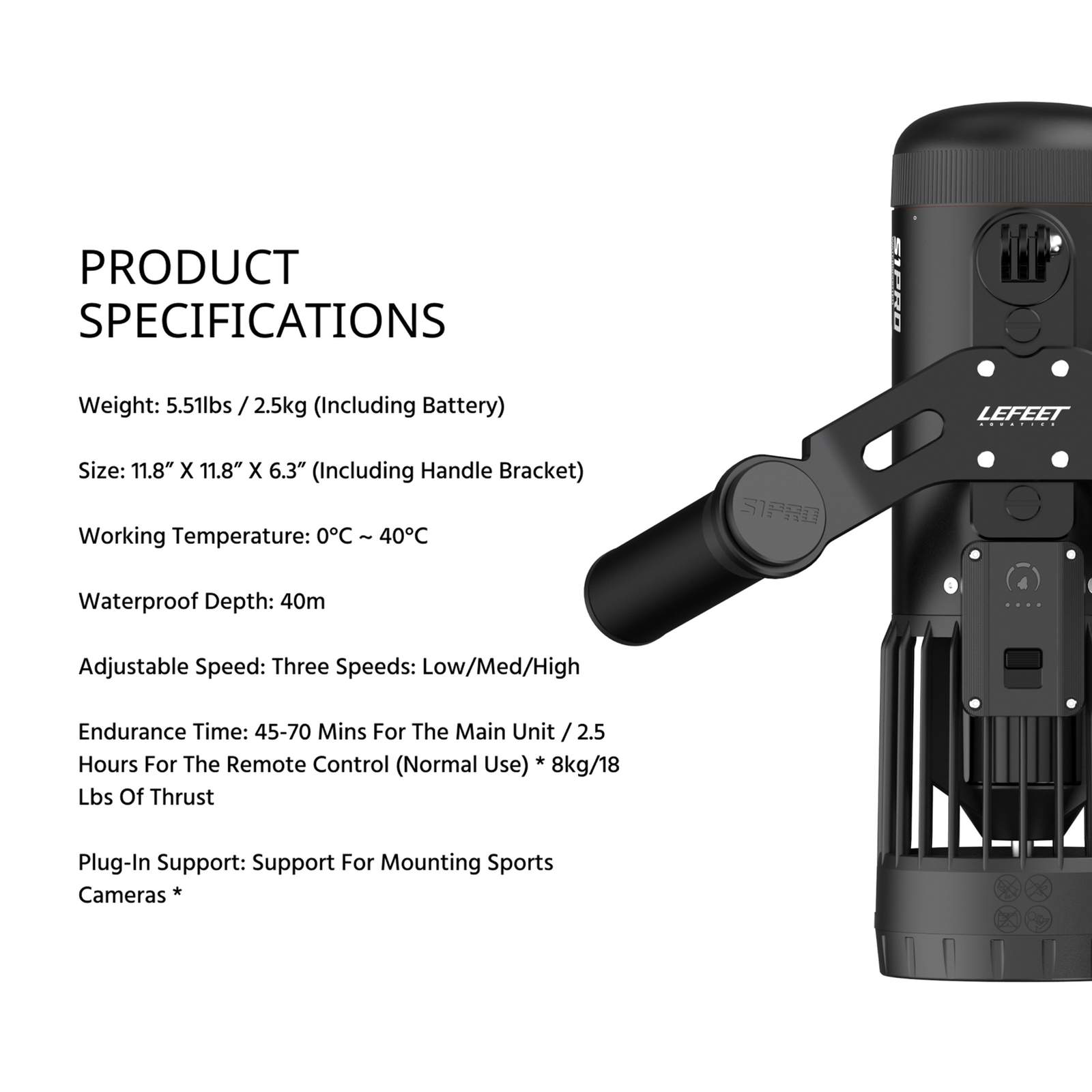 Specifications: - Manufacturer: Lefeet - SKU: C010022 - Material: High-strength sealed housing; corrosion-resistant components (manufacturer does not specify exact composition) - Size/Dimensions: 30 × 10.2 × 10.2 cm (main unit); 30 × 30 × 16 cm with handle bracket - Weight: 2.5 kg / 5.51 lb (including battery) - Color: Black - Size: One size - Category: Scooters - Age Group: Adults - Gender: Unisex - Working Temperature: 0°C to 40°C (32°F to 104°F) - Depth Rating: 40 m / 131.2 ft - Speeds: 3 modes; max 1.8 m/s (single); up to 2.3 m/s (dual-jet setup) - Thrust: 8 kgf / 17.6 lbf - Battery: 4400 mAh, 97.68 Wh; runtime 35–70 min; quick swap - Charging: 25.2 V, 3 A; battery charge time ~2.5 h; remote control ~1.5 h - Remote: Underwater wireless control; typical effective range up to ~1.5 m; can control multiple units within ~150 cm/60 in - Battery Weight: 0.76 kg / 1.68 lb - Charging Temperature: 10°C to 45°C (50°F to 113°F)