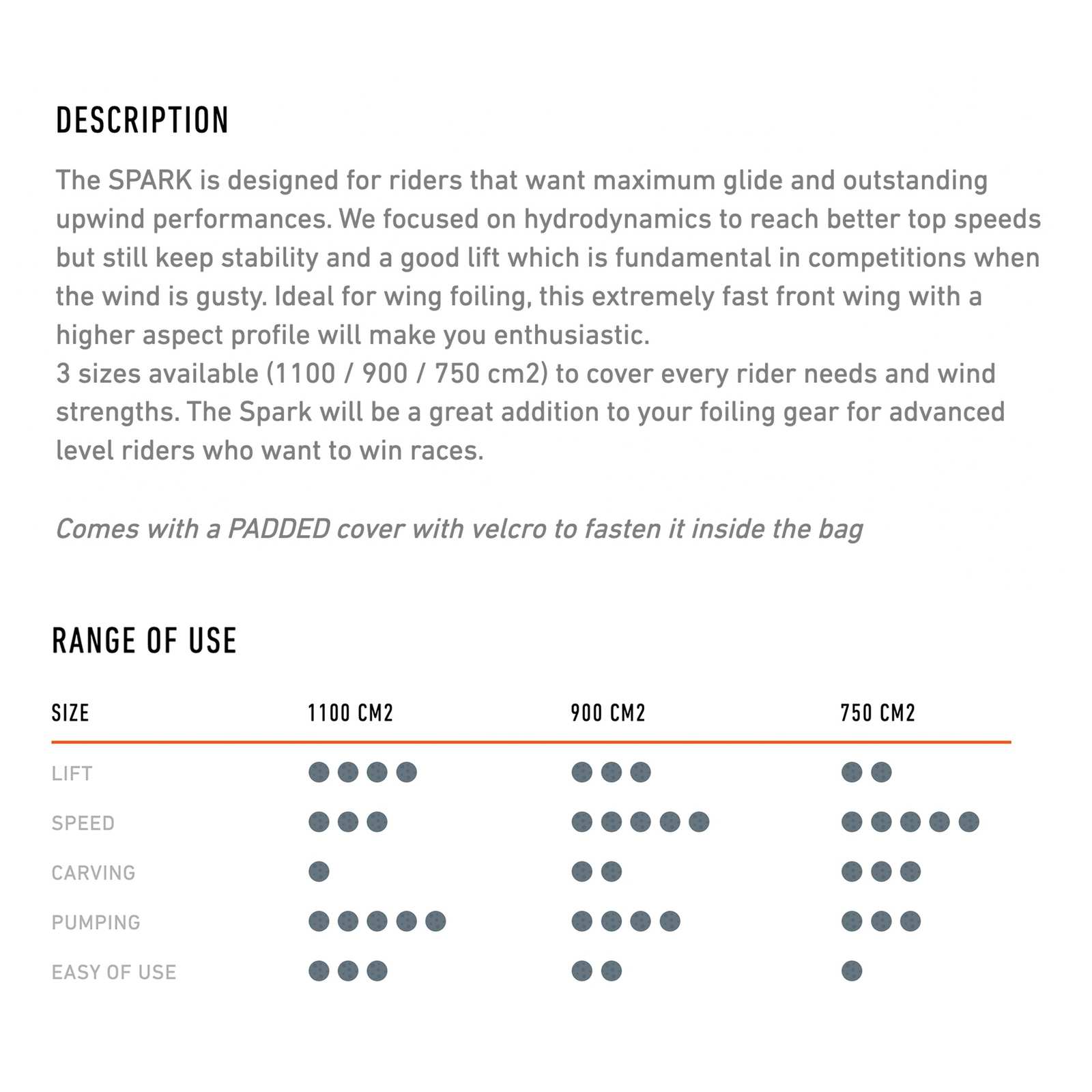 - Disponibilidad en tres tamaños (1100 / 900 / 750 cm2) para adaptarse a diversas condiciones de viento y habilidades de los usuarios.