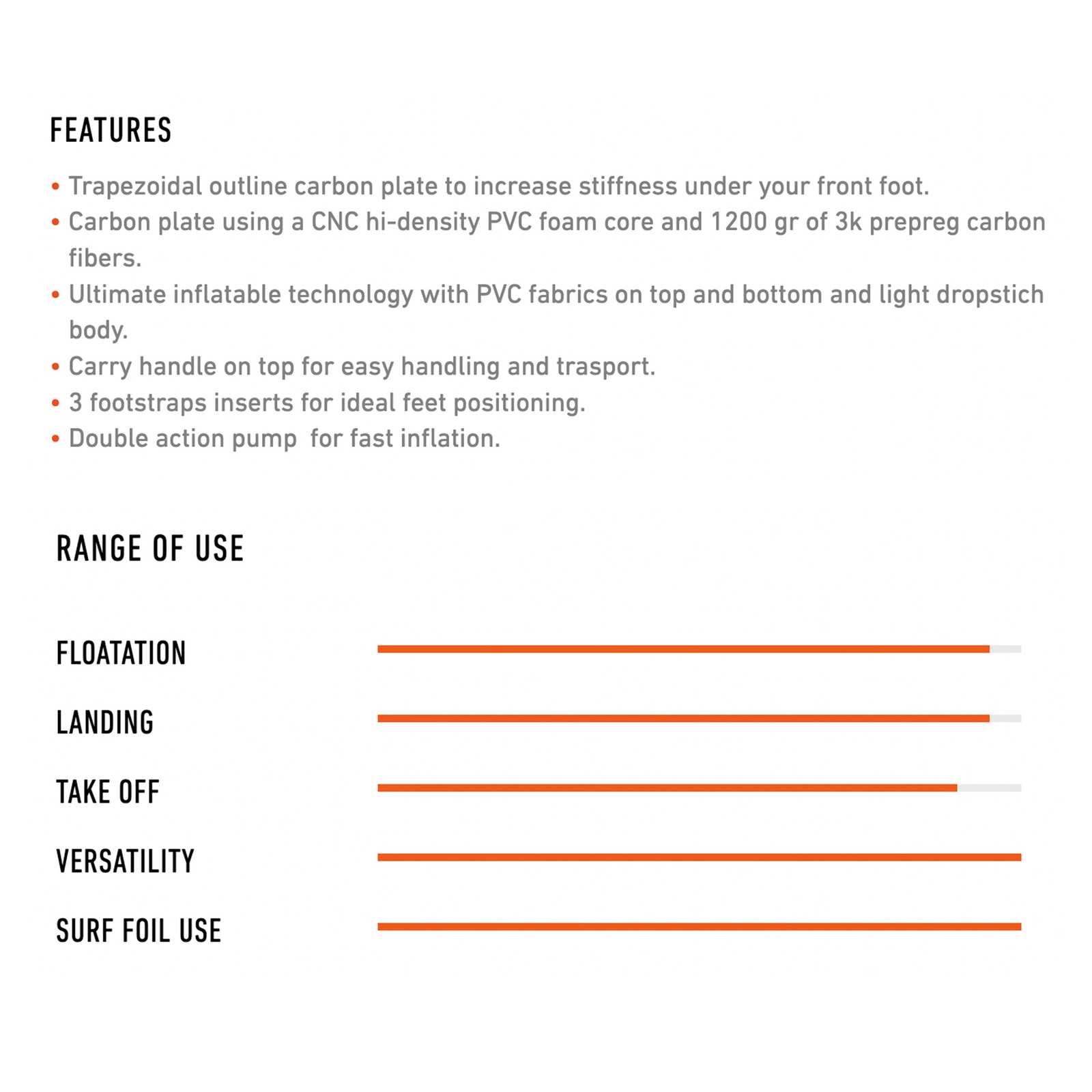 - Construcción con placa de carbono de alta densidad y núcleo de espuma PVC para máxima rigidez.