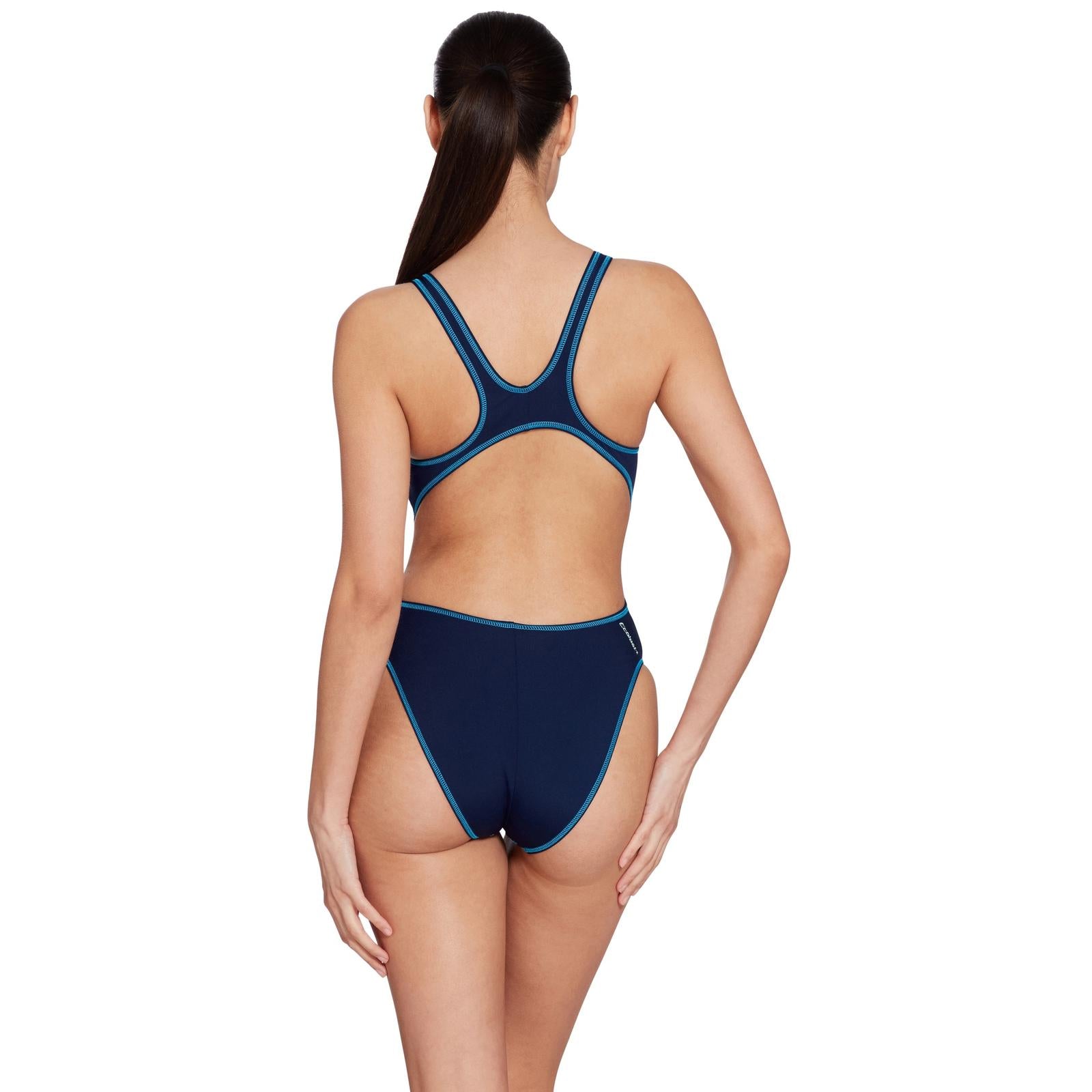 The One Piece Swimsuit Melbourne Haxback in Navy-Light-Blue is the ultimate choice for female swimmers who seek comfort intertwined with modern style. This swimsuit features a high-leg cut and a streamlined Haxback design that promotes optimal freedom of movement, making it ideal for both training and leisure swimming. Crafted from Ecolast+ fabric, it is made with recycled materials and offers impressive chlorine resistance and durability, thereby preserving its shape and elasticity through regular use.