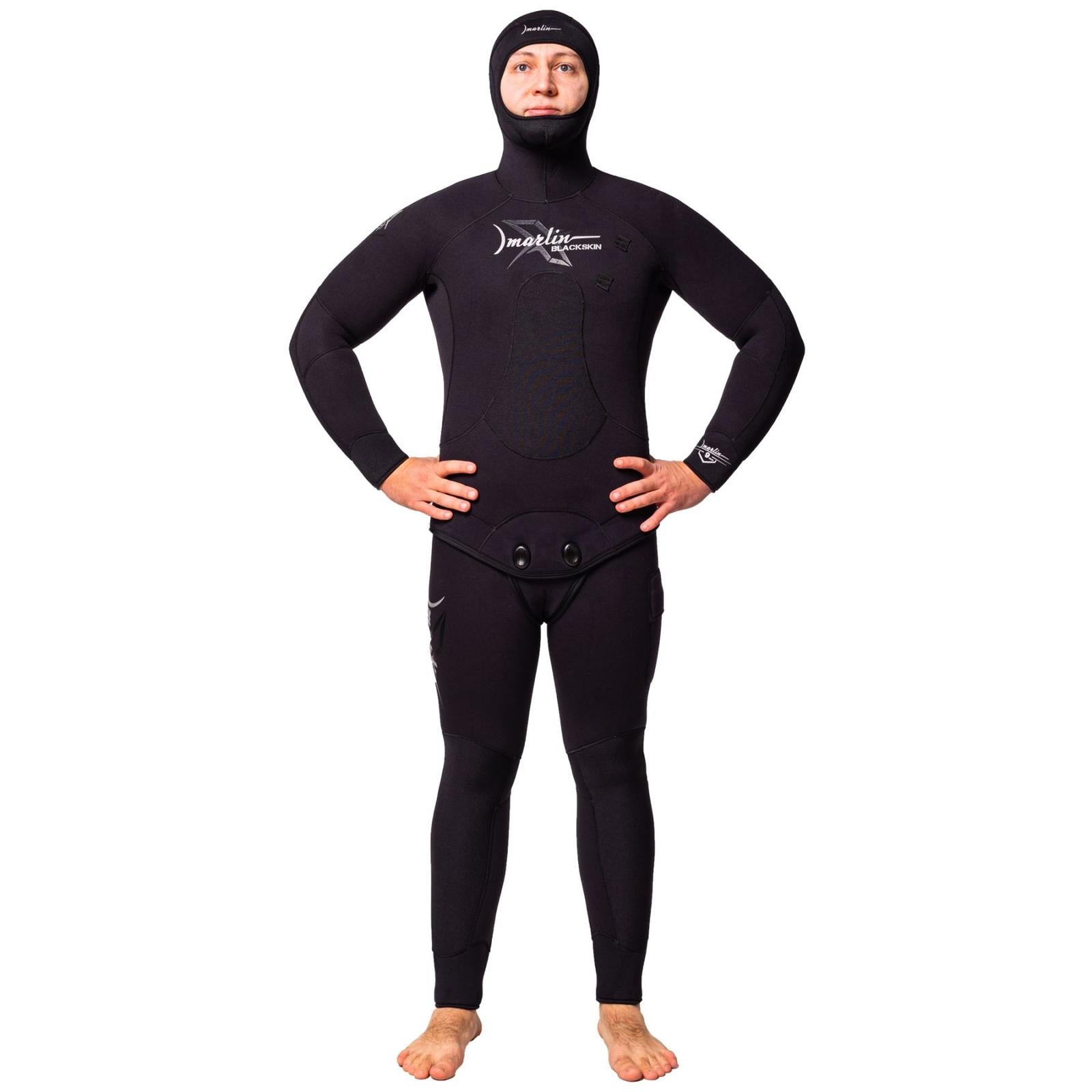 Experience unparalleled thermal protection and comfort with the Marlin BLACKSKIN 9mm Full Wetsuit, designed exclusively for male spearfishing enthusiasts. Craftsmanship meets innovation with a high-performance two-piece suit that features a hooded jacket and Long John pants. Constructed from 100% super stretch premium limestone neoprene, the wetsuit provides incredible flexibility while offering maximum thermal insulation for extremely cold water conditions. The open cell interior ensures a snug fit, while the durable nylon exterior protects against wear and tear associated with rugged underwater activities. With its preformed anatomical cut and customizable features, this wetsuit allows for total freedom of movement during your underwater adventures, making it a top choice for both recreational and professional divers.